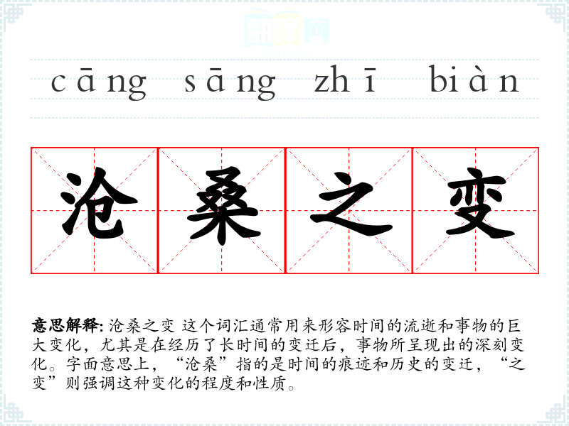 沧桑之变 这个词汇通常用来形容时间的流逝和事物的巨大变化,尤其是在经历了长时间的变迁后,事物所呈现出的深刻变化。字面意思上,“沧桑”指的是时间的痕迹和历史的变迁,“之变”则强调这种变化的程度和性质。