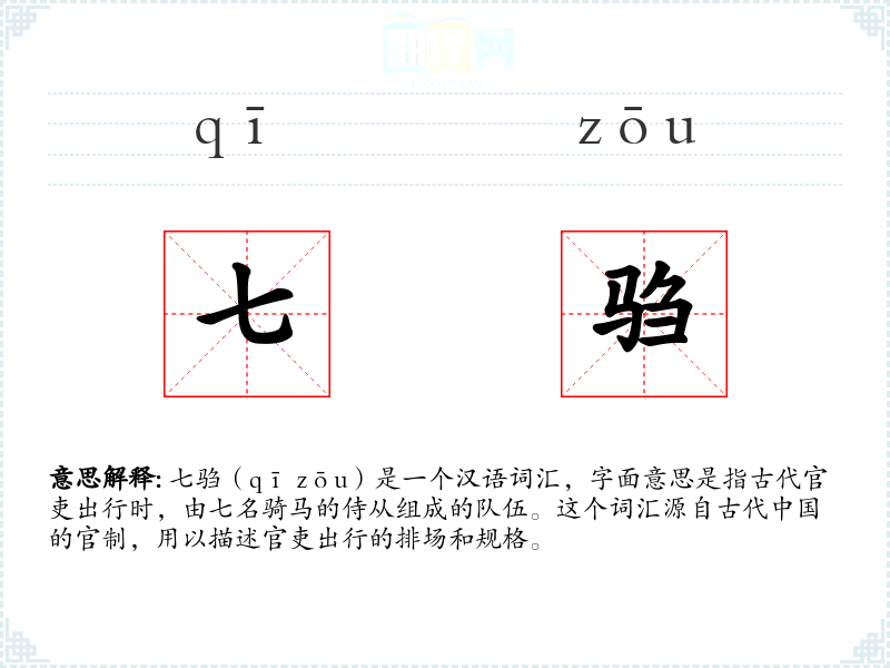 七驺(qī zōu)是一个汉语词汇,字面意思是指古代官吏出行时,由七名骑马的侍从组成的队伍。这个词汇源自古代**的官制,用以描述官吏出行的排场和规格。