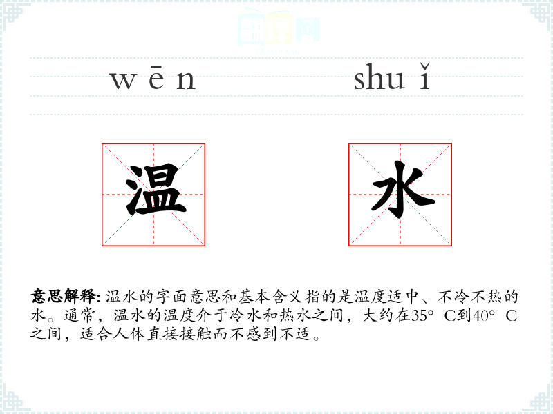 温水的字面意思和基本含义指的是温度适中、不冷不热的水。通常,温水的温度介于冷水和热水之间,大约在35°C到40°C之间,适合人体直接接触而不感到不适。