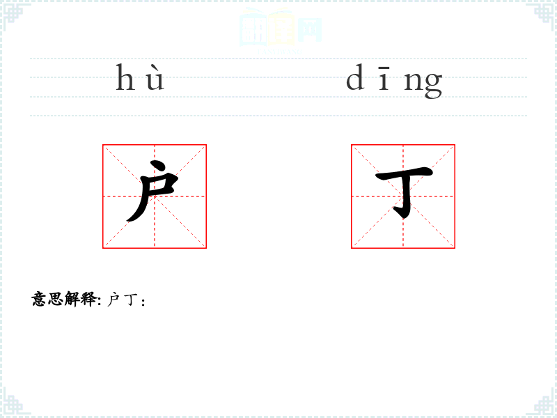 - 词源:户丁一词源自古代汉语,其中“户”指家庭,“丁”指成年男性。