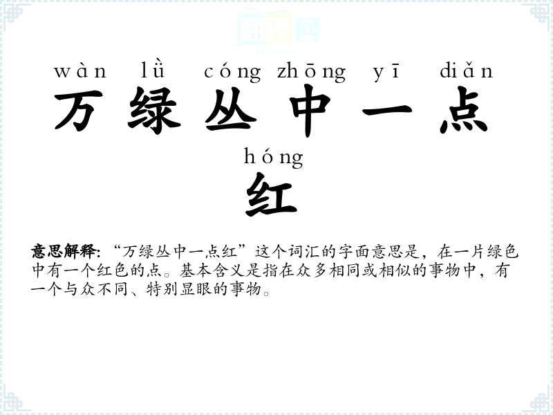 “万绿丛中一点红”这个词汇的字面意思是,在一片绿色中有一个红色的点。基本含义是指在众多相同或相似的事物中,有一个与众不同、特别显眼的事物。