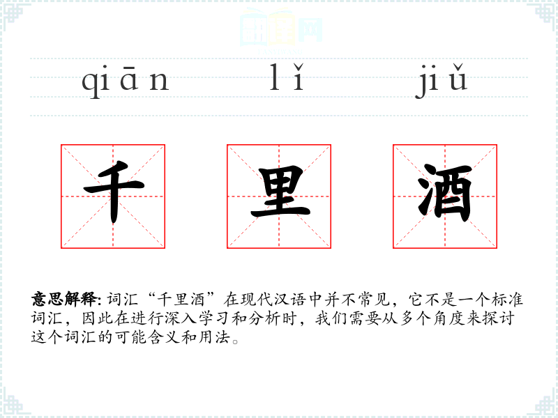 词汇“千里酒”在现代汉语中并不常见,它不是一个标准词汇,因此在进行深入学*和分析时,我们需要从多个角度来探讨这个词汇的可能含义和用法。
