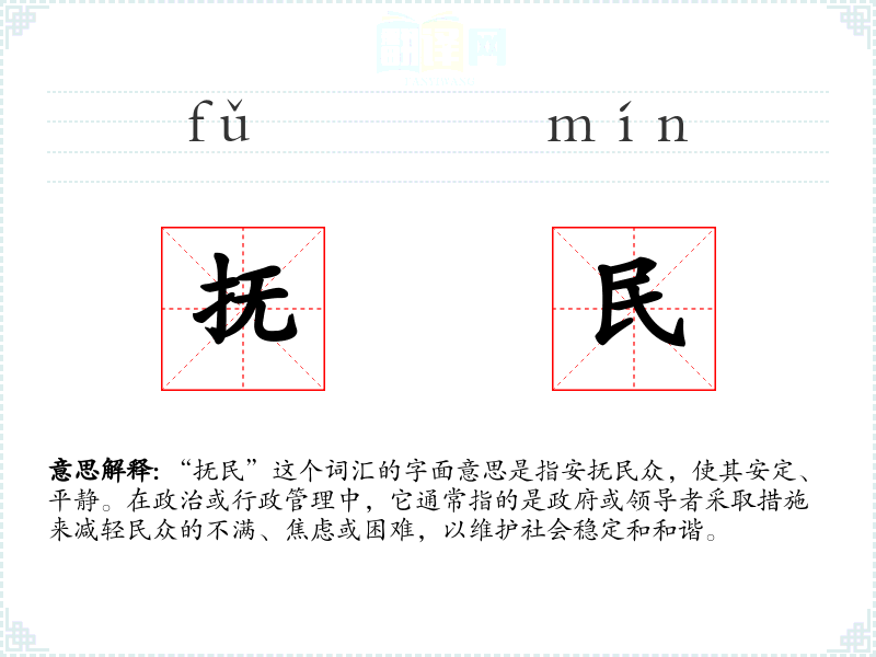 “抚民”这个词汇的字面意思是指安抚民众,使其安定、平静。在政治或行政管理中,它通常指的是政府或领导者采取措施来减轻民众的不满、焦虑或困难,以维护社会稳定和和谐。