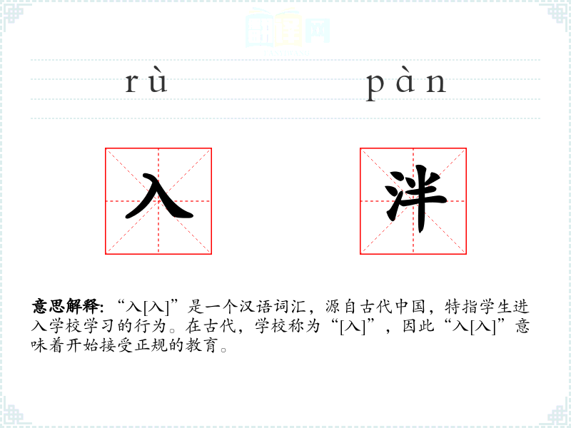 “入[入]”是一个汉语词汇,源自古代*,特指学生进入学校学的行为。在古代,学校称为“[入]”,因此“入[入]”意味着开始接受正规的教育。