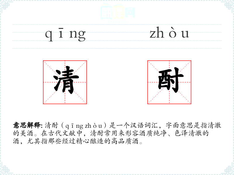 清酎(qīng zhòu)是一个汉语词汇,字面意思是指清澈的美酒。在古代文献中,清酎常用来形容酒质纯净、色泽清澈的酒,尤其指那些经过精心酿造的高品质酒。