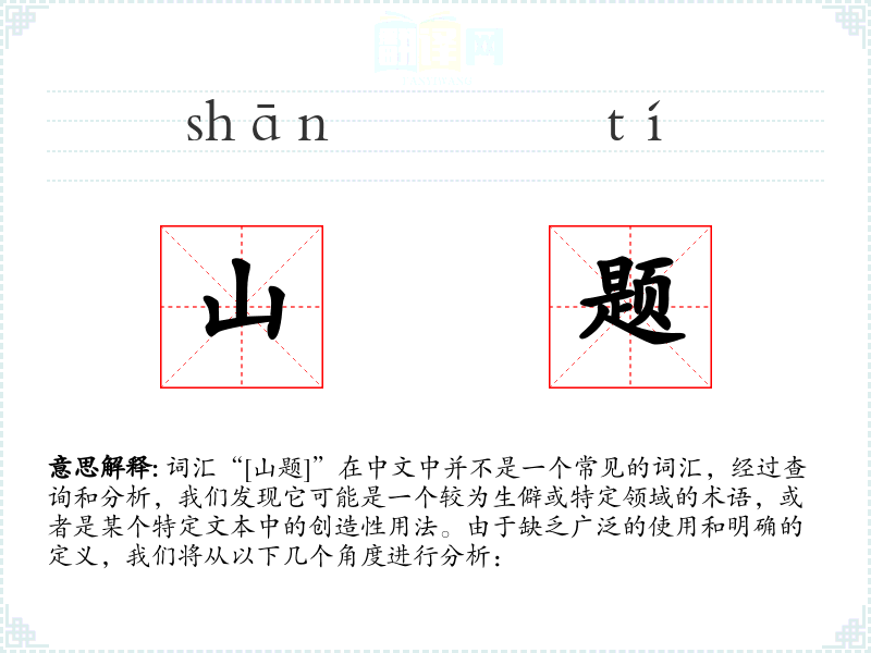 由于“[山题]”不是一个标准词汇,我们无法给出确切的基本定义。它可能是指与山有关的题目或问题,或者是某个特定领域中的术语。