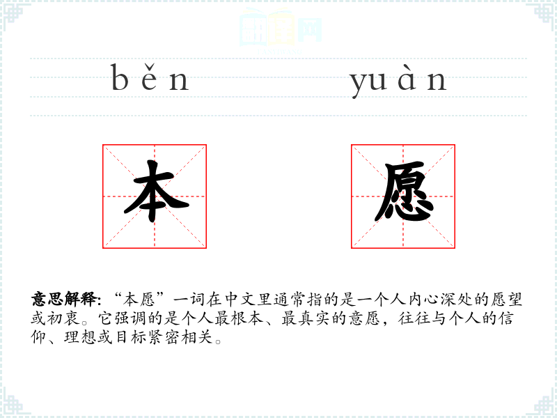“本愿”一词给人以坚定、纯净和深远的情感联想。它让人想到那些为了理想不懈奋斗的人,以及那些在逆境中依然坚守初衷的故事。