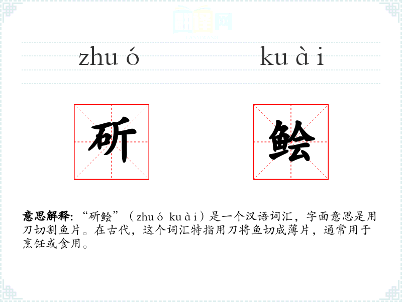 “斫鲙”(zhuó kuài)是一个汉语词汇,字面意思是用刀切割鱼片。在古代,这个词汇特指用刀将鱼切成*片,通常用于烹饪或食用。
