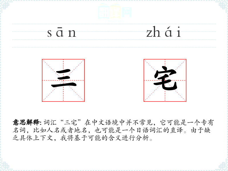 词汇“三宅”在中文语境中并不常见,它可能是一个专有名词,比如人名或者地名,也可能是一个日语词汇的直译。由于缺乏具体上下文,我将基于可能的含义进行分析。