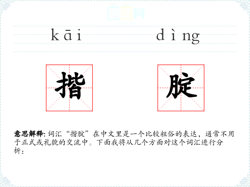 词汇“揩腚”在中文里是一个比较粗俗的表达,通常不用于正式或礼貌的交流中。下面我将从几个方面对这个词汇进行分析: