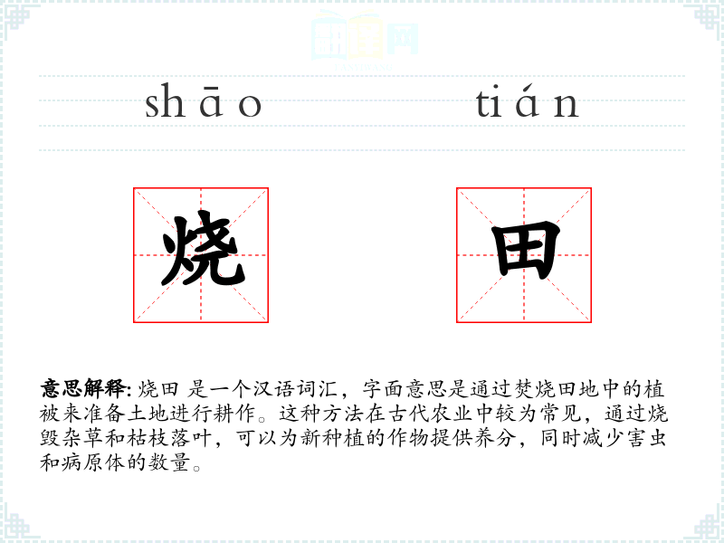 烧田 是一个汉语词汇,字面意思是通过焚烧田地中的植被来准备土地进行耕作。这种方法在古代农业中较为常见,通过烧毁杂草和枯枝落叶,可以为新种植的作物提供养分,同时减少害虫和病原体的数量。