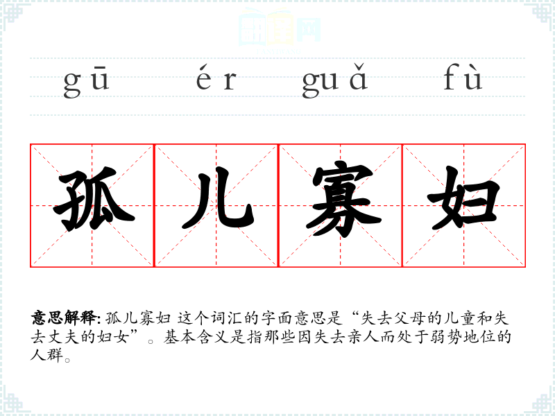 孤儿寡妇 这个词汇的字面意思是“失去父母的儿童和失去丈夫的妇女”。基本含义是指那些因失去亲人而处于弱势地位的人群。