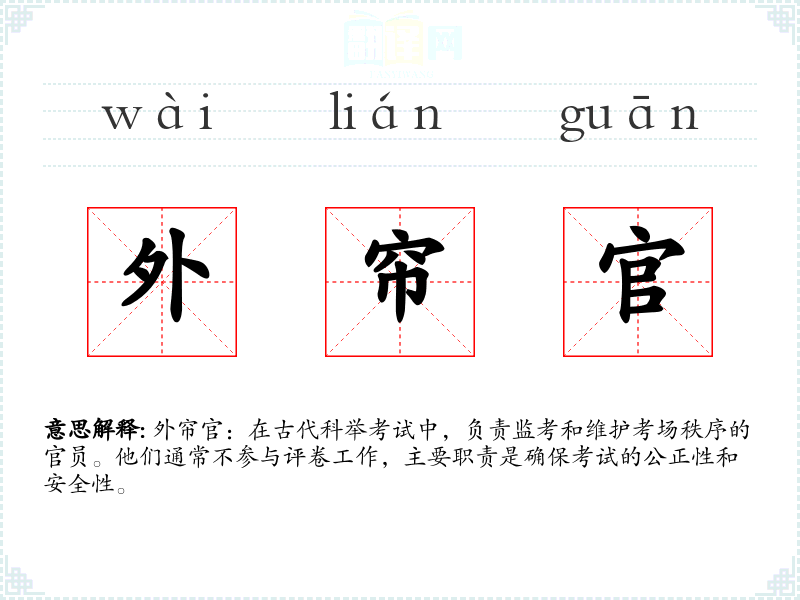 外帘官:在古代科举考试中,负责监考和维护考场秩序的官员。他们通常不参与评卷工作,主要职责是确保考试的公正性和安全性。