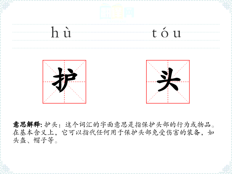 “护头”这个词汇在中文中相对直接,由“护”(保护)和“头”(头部)组成。它的使用历史悠久,随着安全意识的提高,其重要性逐渐增加。