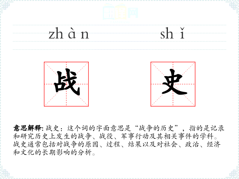 “战史”一词由“战”和“史”两个汉字组成。在古代汉语中,“战”指的是战斗或战争,“史”则是指历史记录。随着时间的推移,这个词被用来专门指代战争的历史记录和研究。