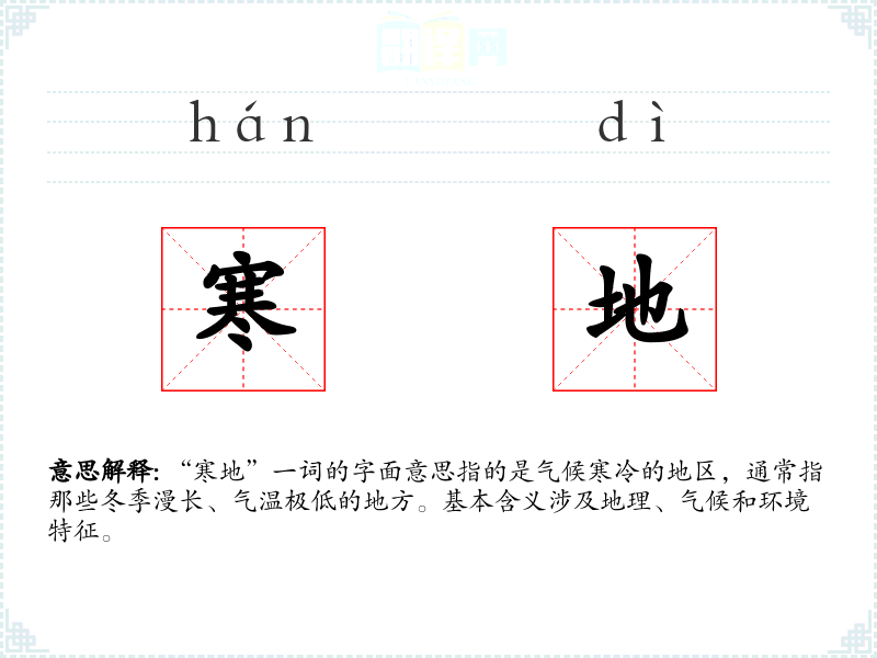 “寒地”由“寒”和“地”两个字组成。“寒”源自古代汉语,意为冷;“地”则指土地或地区。随着时间的推移,这个词在汉语中保持了其基本含义,但在不同的语境中有所扩展。