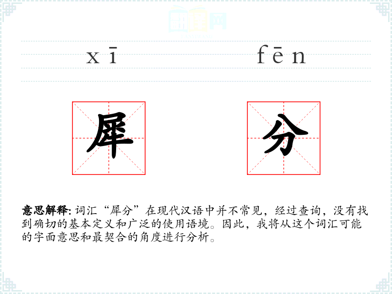 “犀分”字面意思可能是指“犀牛的分界”或“犀牛的区分”。由于缺乏具体的语料支持,这个解释仅仅是基于字面组合的猜测。