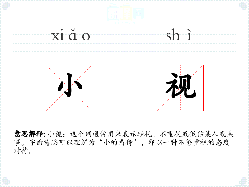 小视:这个词通常用来表示轻视、不重视或低估某人或某事。字面意思可以理解为“小的看待”,即以一种不够重视的态度对待。