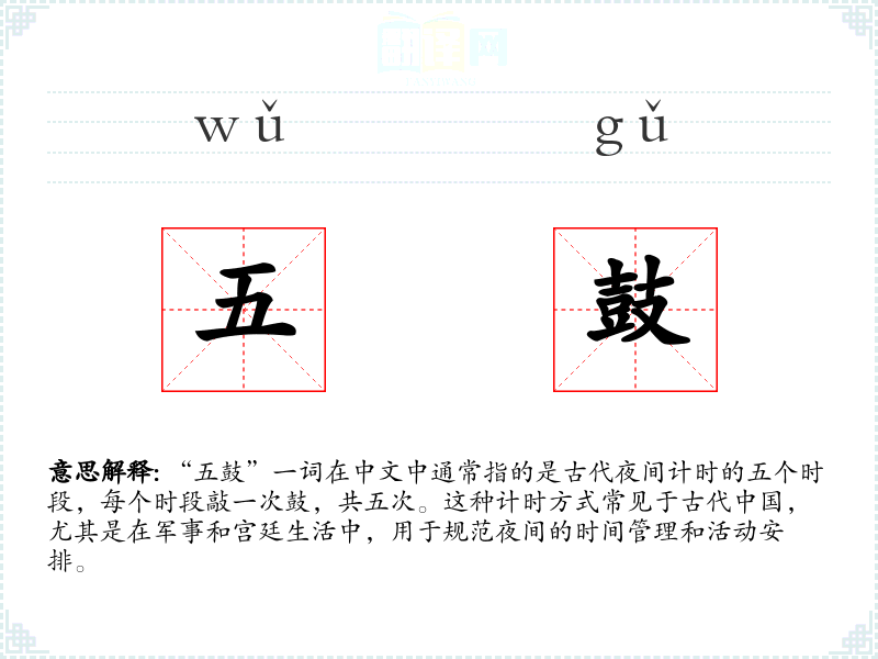 - 专业领域:在历史学或考古学中,研究古代计时方式时会提及“五鼓”。