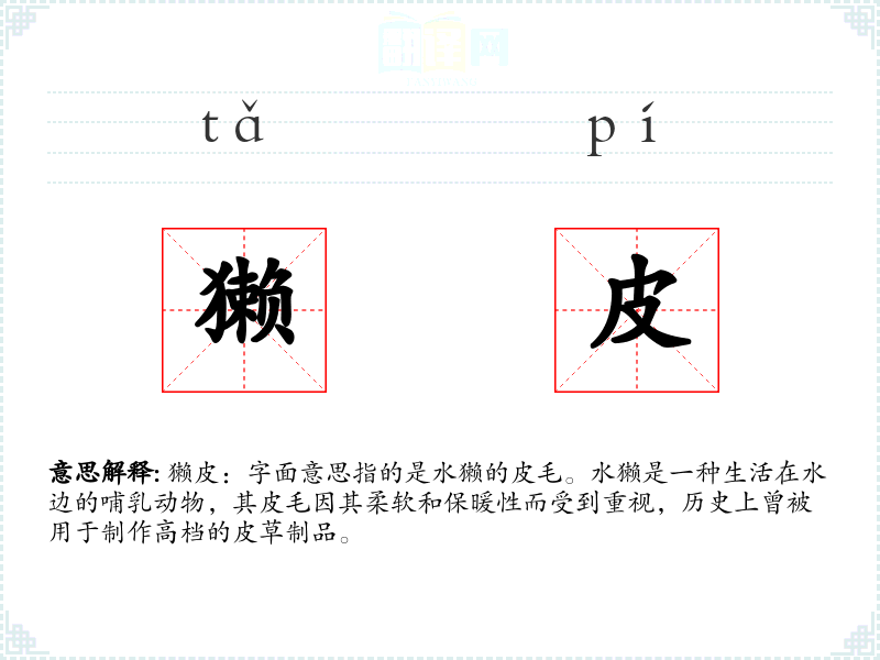 - 反义词:无(由于獭皮特指水獭的皮毛,没有直接的反义词)