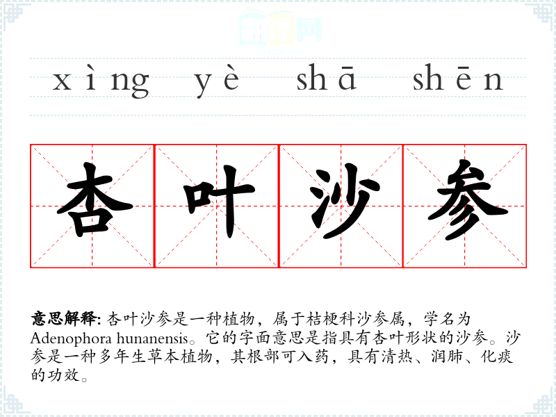 杏叶沙参是一种植物,属于桔梗科沙参属,学名为 Adenophora hunanensis。它的字面意思是指具有杏叶形状的沙参。沙参是一种多年生草本植物,其根部可入药,具有清热、润肺、化痰的功效。