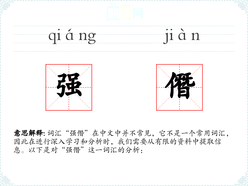 词汇“强僭”在中文中并不常见,它不是一个常用词汇,因此在进行深入学*和分析时,我们需要从有限的资料中提取信息。以下是对“强僭”这一词汇的分析: