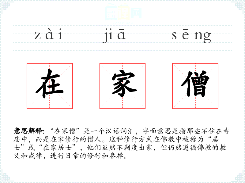 同义词:居士、在家居士、俗家弟子 反义词:出家僧、比丘、比丘尼