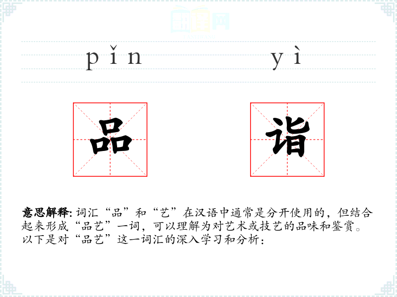 - 品艺:结合来看,“品艺”可以理解为对艺术或技艺的品味和鉴赏,强调对艺术作品或技艺的高水平理解和评价。