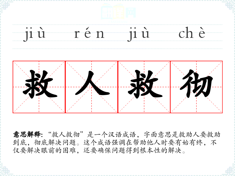 “救人救彻”是一个汉语成语,字面意思是救助人要救助到底,彻底解决问题。这个成语强调在帮助他人时要有始有终,不仅要解决眼前的困难,还要确保问题得到根本性的解决。