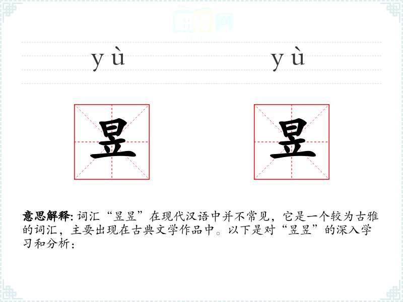 词汇“昱昱”在现代汉语中并不常见,它是一个较为古雅的词汇,主要出现在古典文学作品中。以下是对“昱昱”的深入学*和分析: