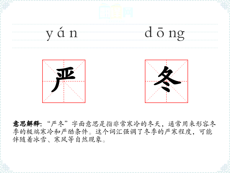 “严冬”字面意思是指非常寒冷的冬天,通常用来形容冬季的极端寒冷和严酷条件。这个词汇强调了冬季的严寒程度,可能伴随着冰雪、寒风等自然现象。