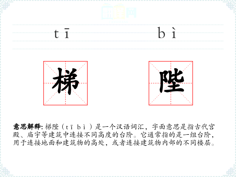 梯陛(tī bì)是一个汉语词汇,字面意思是指古代宫殿、庙宇等建筑中连接不同高度的台阶。它通常指的是一组台阶,用于连接地面和建筑物的高处,或者连接建筑物内部的不同楼层。