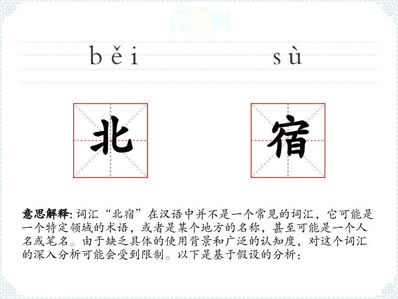 由于“北宿”不是一个常用词汇,对其的理解和应用可能有限。在语言学习和表达中,它可能不是一个关键词汇,但在特定的语境或创作中,它可以成为一个有趣的语言元素。