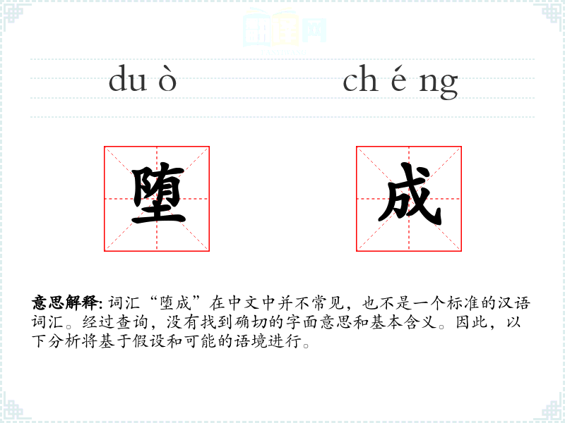 词汇“堕成”在中文中并不常见,也不是一个标准的汉语词汇。经过查询,没有找到确切的字面意思和基本含义。因此,以下分析将基于假设和可能的语境进行。