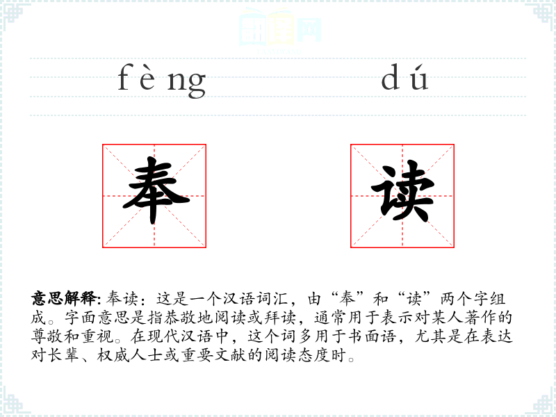 奉读:这是一个汉语词汇,由“奉”和“读”两个字组成。字面意思是指恭敬地阅读或拜读,通常用于表示对某人著作的尊敬和重视。在现代汉语中,这个词多用于书面语,尤其是在表达对长辈、权威人士或重要文献的阅读态度时。