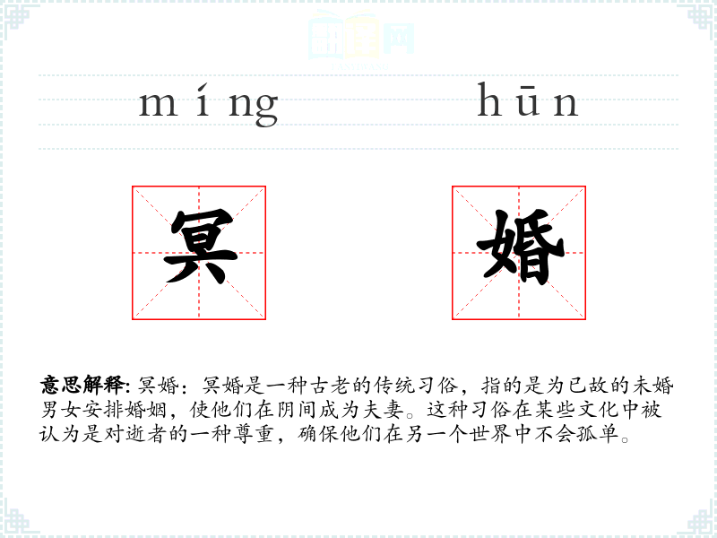 冥婚作为一个词汇,不仅反映了人类对死亡的恐惧和对生命的尊重,也揭示了不同文化中对婚姻和家庭的看法。在语言学*和表达中,了解这样的词汇可以帮助我们更好地理解人类文化和历史的多样性。