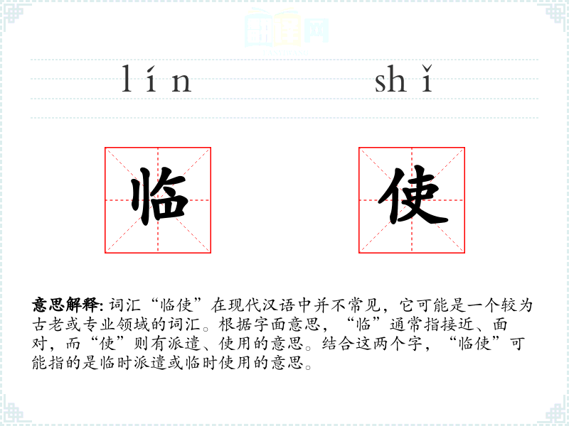 - 理解:临使是一个具有特定历史和文化背景的词汇,虽然在现代使用频率不高,但在特定领域仍有其重要性。