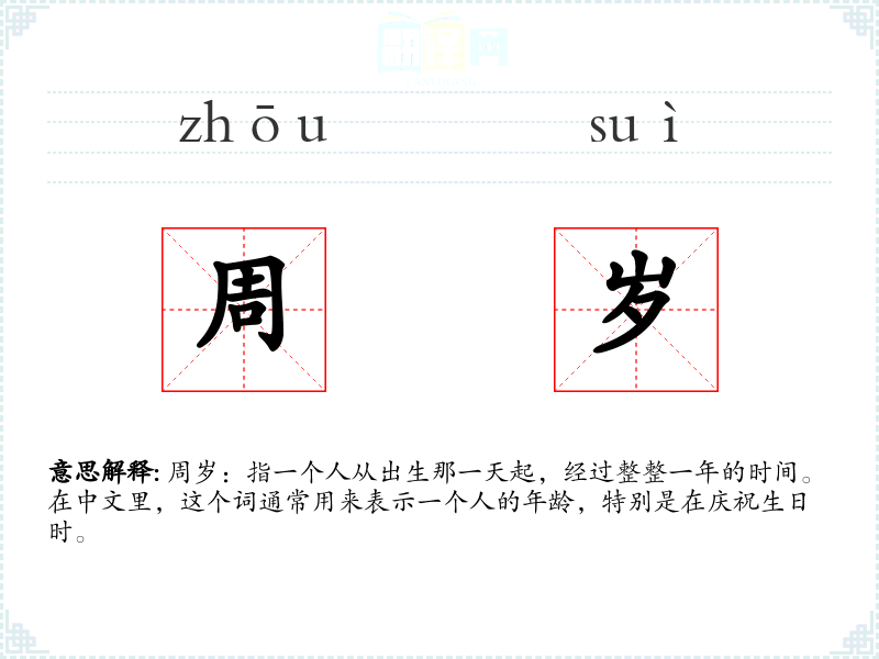 周岁:指一个人从出生那一天起,经过整整一年的时间。在中文里,这个词通常用来表示一个人的年龄,特别是在庆祝生日时。