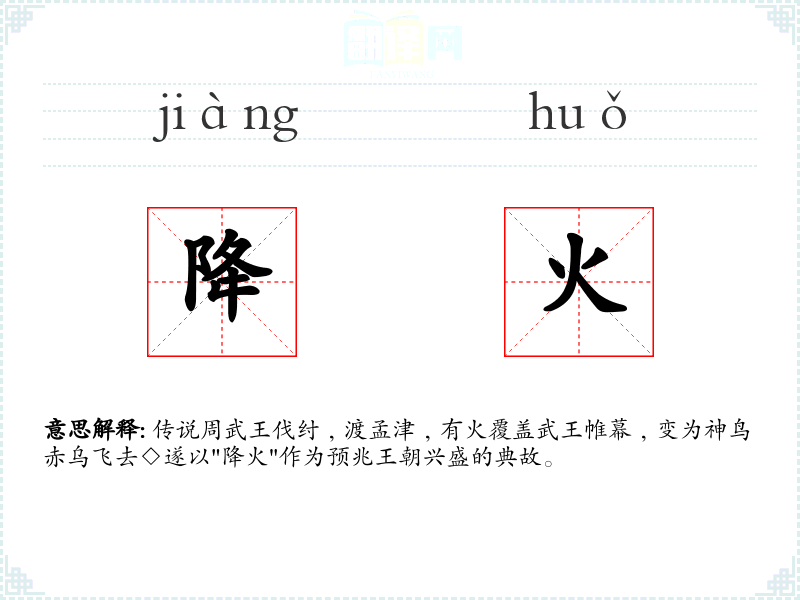 传说周武王伐纣﹐渡孟津﹐有火覆盖武王帷幕﹐变为神鸟赤乌飞去◇遂以"降火"作为预兆王朝兴盛的典故。