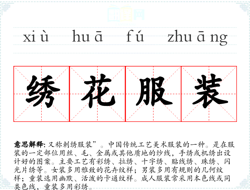 1.又称刺绣服装”。中国传统工艺美术服装的一种。是在服装的一定部位用丝、毛、金属或其他质地的纱线,手绣或机绣出设计好的图案。主要工艺有彩绣、拉绣、十字绣、贴线绣、珠绣、闪光片绣等。女装多用雅致的花卉纹样;男装多用有规则的几何纹样;童装选用幽默、活泼的卡通纹样。成人服装常采用本色线或同类色线,童装多用彩绣。