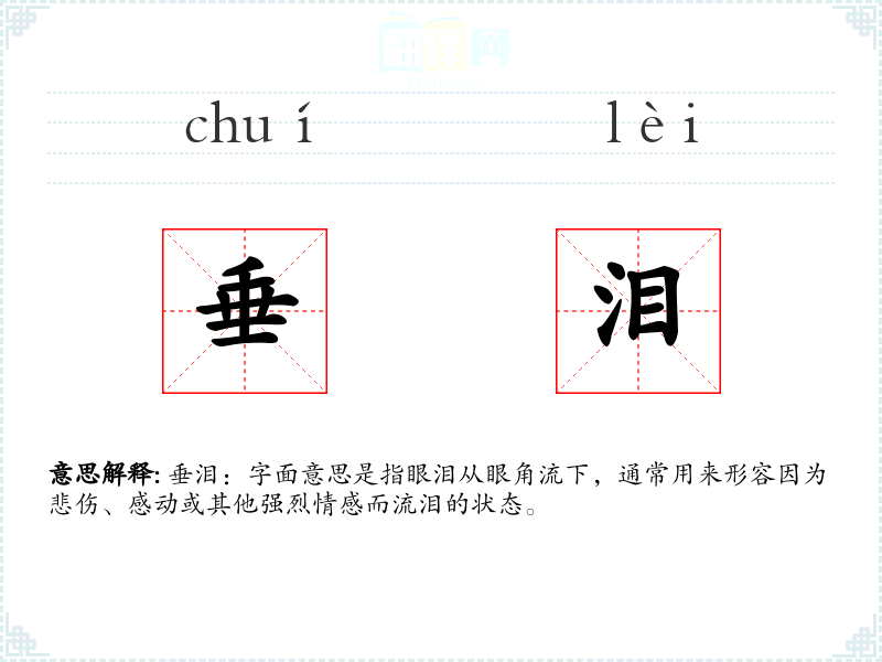 垂泪:字面意思是指眼泪从眼角流下,通常用来形容因为悲伤、感动或其他强烈情感而流泪的状态。