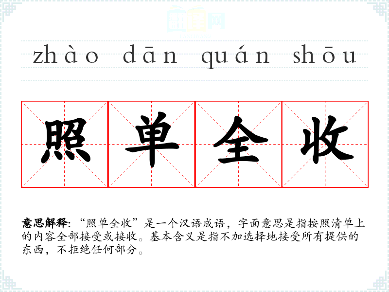 “照单全收”是一个汉语成语,字面意思是指按照清单上的内容全部接受或接收。基本含义是指不加选择地接受所有提供的东西,不拒绝任何部分。