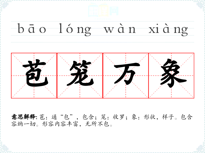 苞:通“包”,包含;笼:收罗;象:形状,样子。包含容纳一切。形容内容丰富,