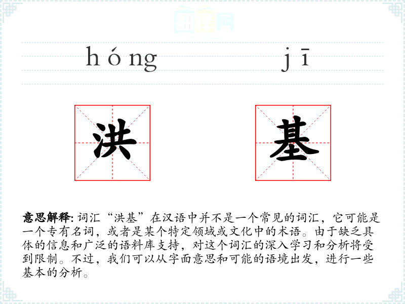 由于“洪基”不是一个常见的词汇,它在不同语境下的使用可能非常有限。如果它是一个专有名词,那么它可能出现在某个特定的文学作品、历史记载、地理名称或者人名中。