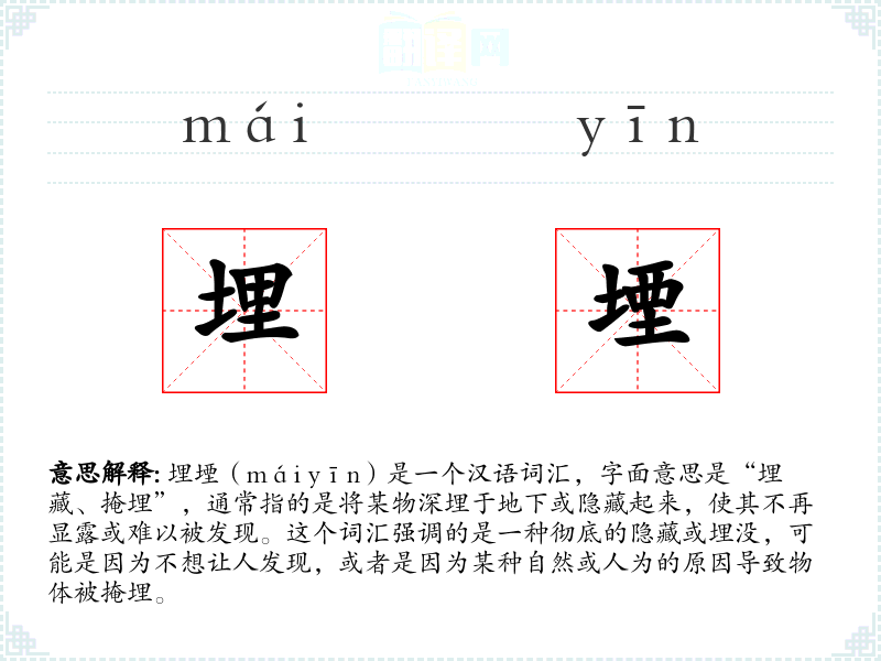 埋堙(mái yīn)是一个汉语词汇,字面意思是“埋藏、掩埋”,通常指的是将某物深埋于地下或隐藏起来,使其不再显露或难以被发现。这个词汇强调的是一种彻底的隐藏或埋没,可能是因为不想让人发现,或者是因为某种自然或人为的原因导致物体被掩埋。