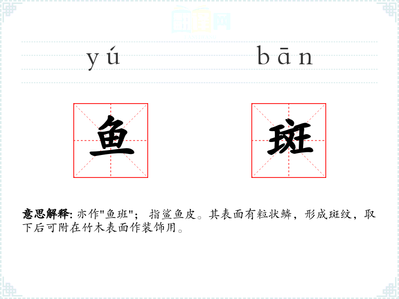 亦作"鱼班"; 指鲨鱼皮。其表面有粒状鳞,形成斑纹,取下后可附在竹木表面作装饰用。