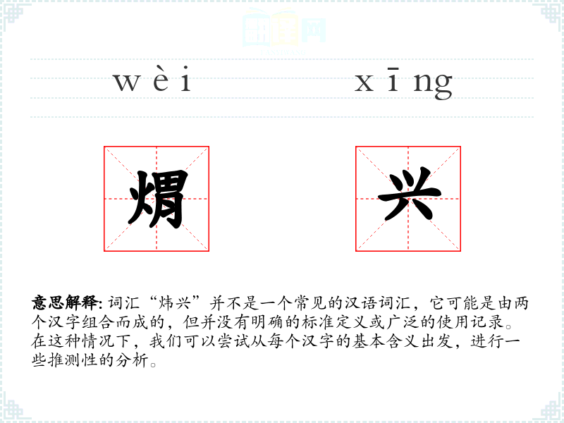 词汇“炜兴”并不是一个常见的汉语词汇,它可能是由两个汉字组合而成的,但并没有明确的标准定义或广泛的使用记录。在这种情况下,我们可以尝试从每个汉字的基本含义出发,进行一些推测性的分析。