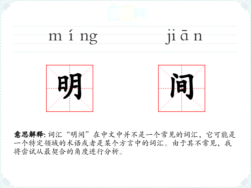 “明间”这个词汇的字面意思可能指的是“明亮的房间”或者“公开的空间”。然而,由于其不常见,具体的定义可能需要参考特定的语境或来源。