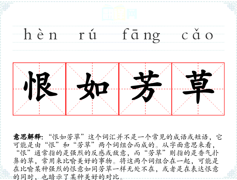 由于“恨如芳草”不是一个标准的成语或短语,它在不同的语境下可能会有不同的解释。在文学作品中,作者可能会用这个组合来创造一种独特的意境,表达复杂的情感。在口语中,这个词汇可能不太常用,但如果使用,可能会用来形容某人的恨意非常深且无处不在。