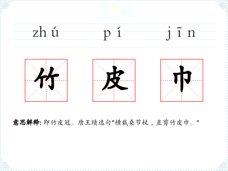 即竹皮冠。唐王绩逸句"横裁桑节杖﹐直剪竹皮巾。"